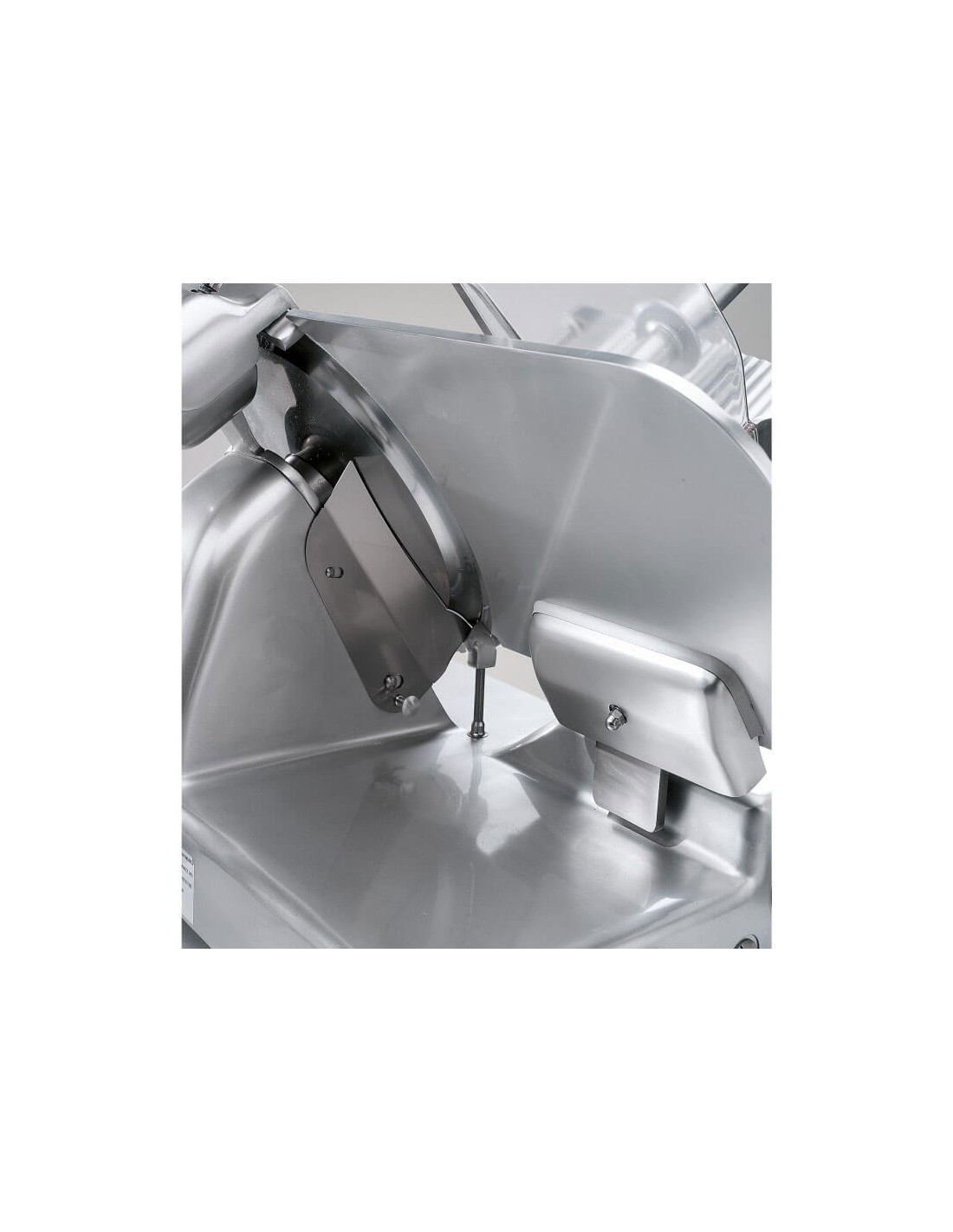 Per la manutenzione, l'affettatrice è dotata di un affilatoio con vaschetta di protezione e di un pratico estrattore lama di serie, che semplificano le operazioni quotidiane. È inoltre disponibile l'accessorio spondina per piatto per una maggiore stabilità dei prodotti.