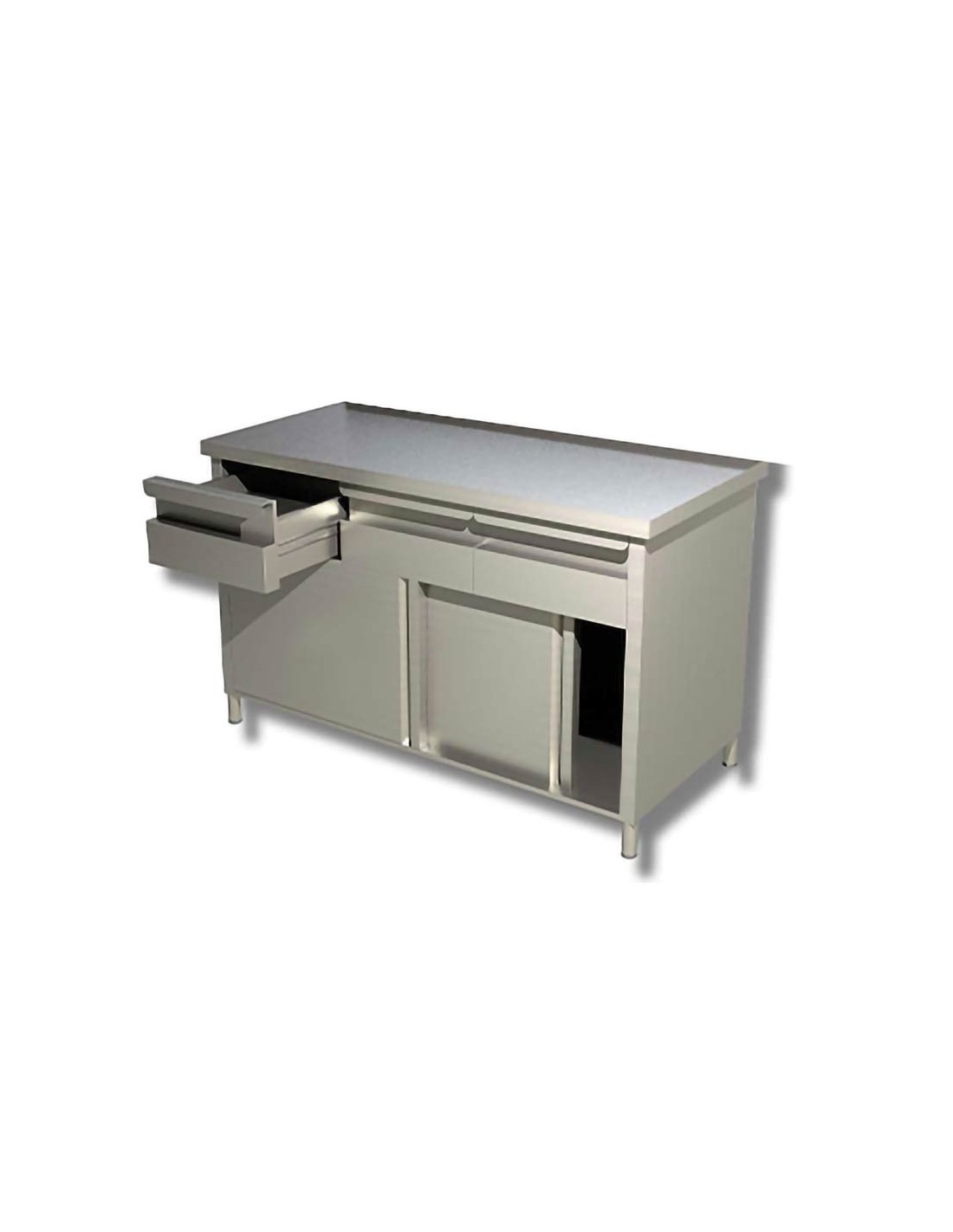 Tavolo armadiato con cassettiera, e con porte scorrevoli realizzate con doppia pannellatura, tamburate e rimovibili.