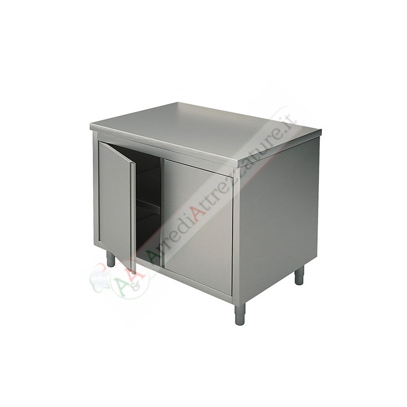 Tavolo da lavoro armadiato in acciaio inossidabile, completo di due ante scorrevoli e una piccola alzatina, con dimensioni di 1200x600x950 mm.