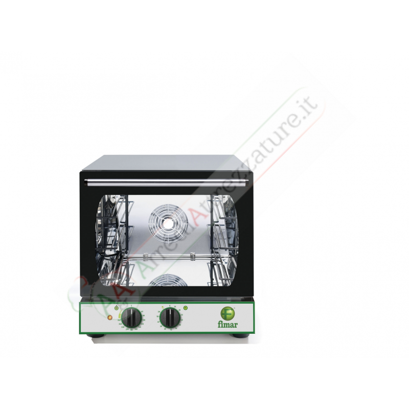 Forno a convezione struttura in acciaio inox - porta a ribalta - illuminazione interna alogena - porta doppio vetro. CMP332M: timer meccanico 0-120’ - supporti per 3 teglie 346x260mm.