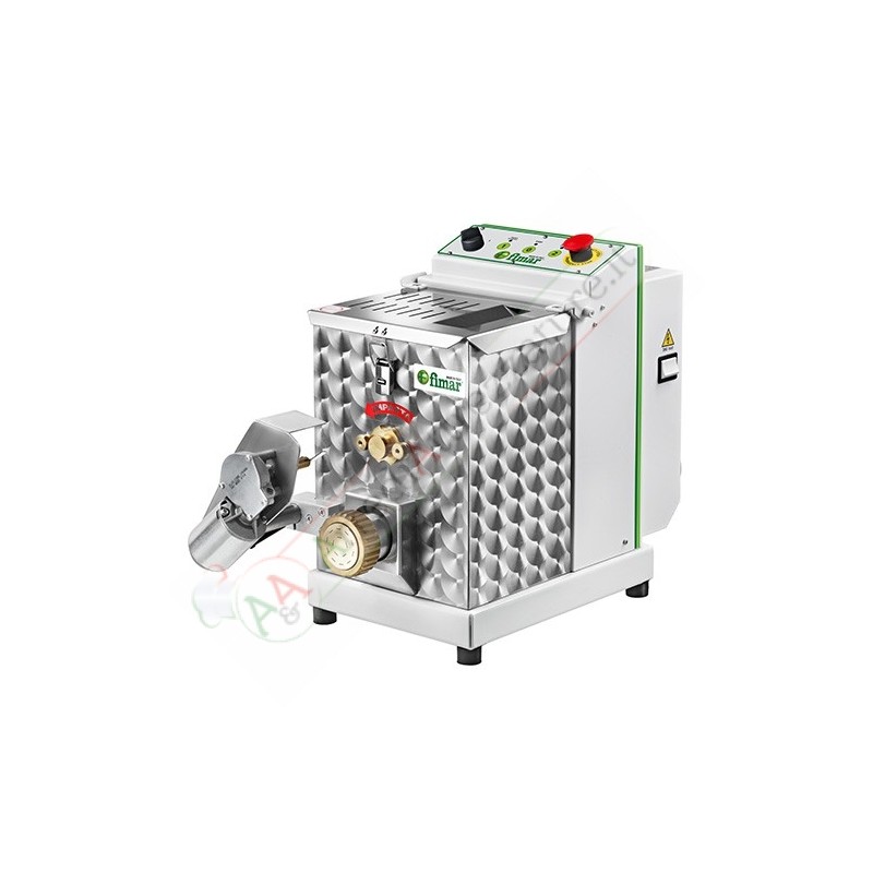 Macchina per impastare ed estrudere impasti all’uovo in diversi formati. Struttura rivestita con vernice antigraffio - vasca e gancio impastatore in acciaio inox - elica in lega ottone/bronzo - microinterruttore su coperchio vasca - versioni MPF4N e MPF8N con raffreddamento della zona di estrusione di serie.