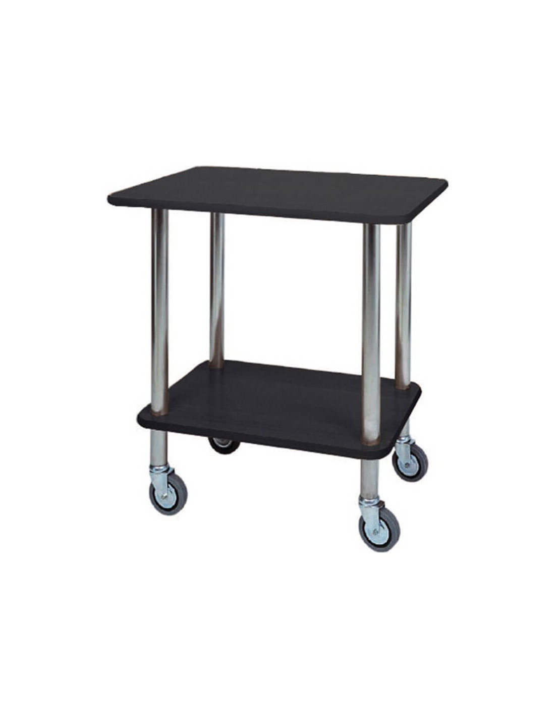 Carrello su ruote con piano in legno e struttura in acciaio inox tubolare alto spessore, con 2 piani in nobilitato e bordo in gomma. 4 ruote bidirezionali da diametro 95.