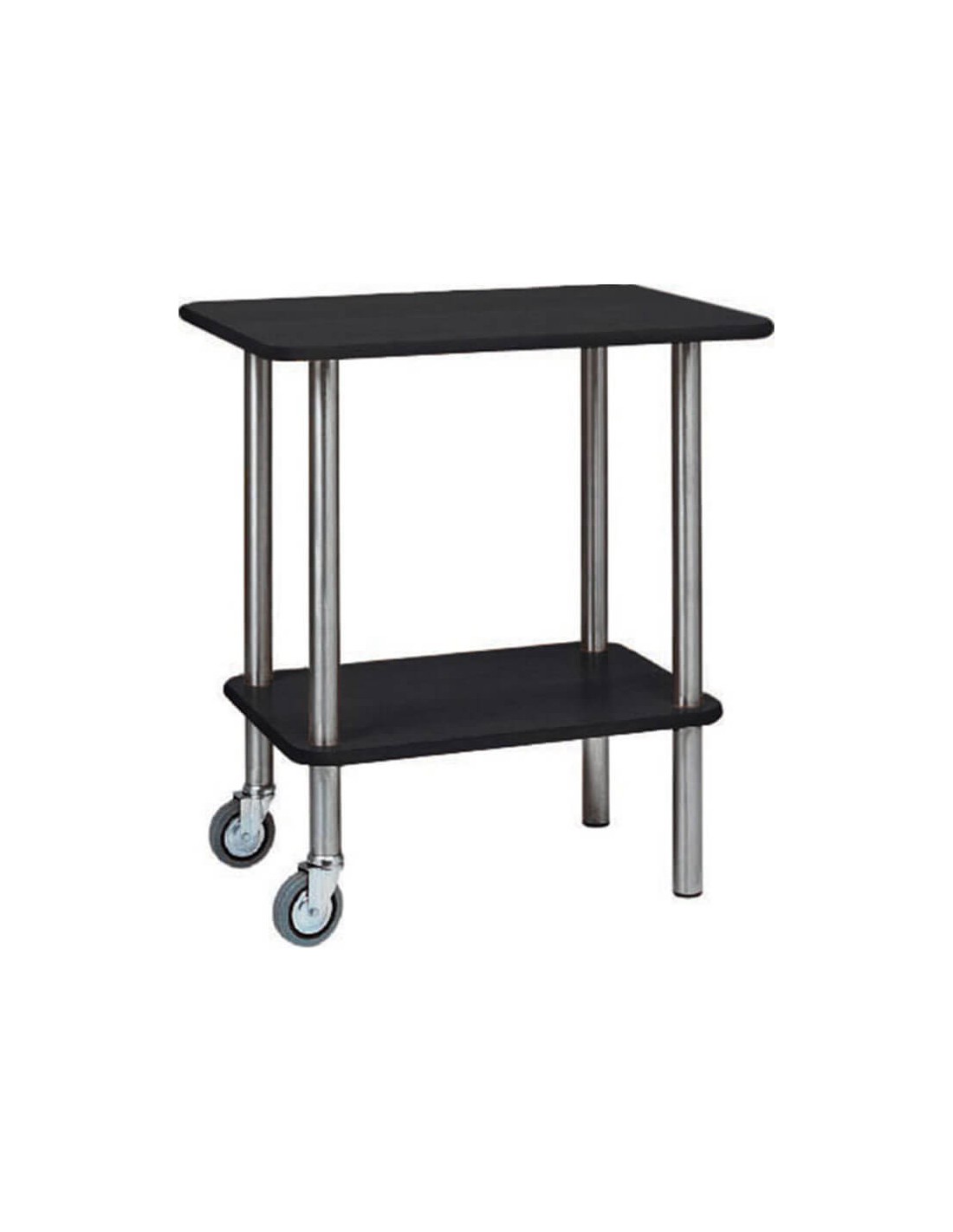 Carrello su ruote con piano in legno e struttura in acciaio inox tubolare alto spessore, con 2 piani in nobilitato noce e bordo in gomma. 2 ruote pivottanti.