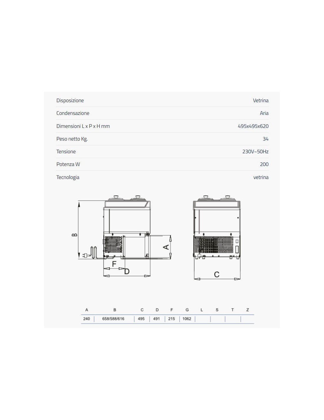 Design Ottimizzato per il Bancone: Le dimensioni compatte (le stesse del modello con vaschette, ovvero 495x495x665h mm con 34 kg di peso) lo rendono perfetto per l'installazione su qualsiasi bancone, senza occupare eccessivo spazio e valorizzando al massimo la tua offerta.