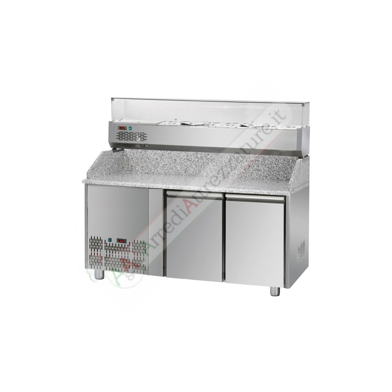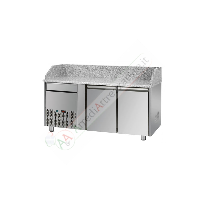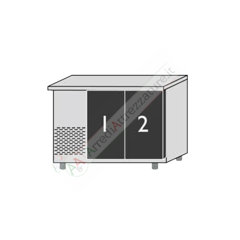 Interno ed esterno in Acciaio Inossidabile, con esclusione del fondo esterno in Acciaio Galvanizzato. Angoli interni arrotondati. Isolamento in poliuretano senza CFC, iniettato ad alta pressione. Spessore dell’isolamento: 40 mm. Porte con chiusura automatica e guarnizione magnetica. Temperatura solo positiva. Pannello di controllo elettronico frontale con sonda NTC. Refrigerazione ventilata. Unità refrigerante a monoblocco estraibile e tropicalizzata di serie (temperatura ambiente +30°C ed umidità relativa del 60%) funzionante con gas R404A/R507. Tavoli disponibili anche nella versione senza unità refrigerante. Sbrinamento ed evaporazione dell’acqua di condensa completamente automatici. Piedi in Acciaio Inossidabile regolabili in altezza. Varie personalizzazioni disponibili a catalogo