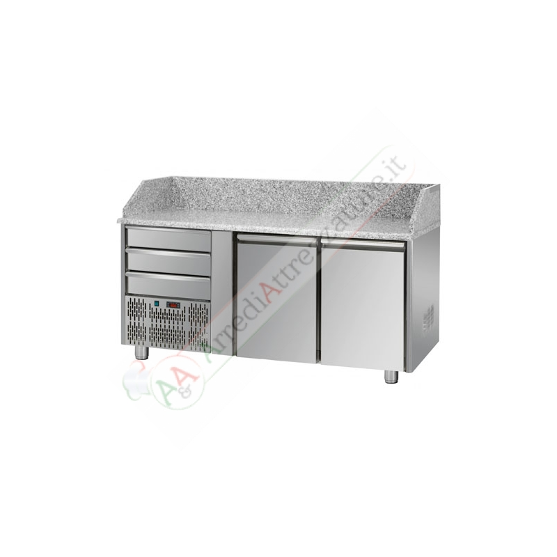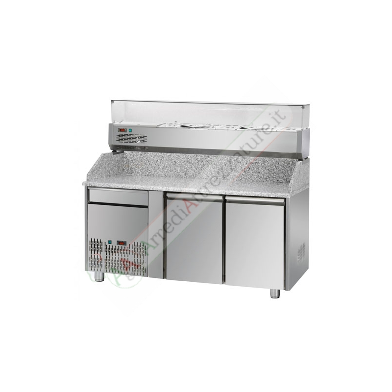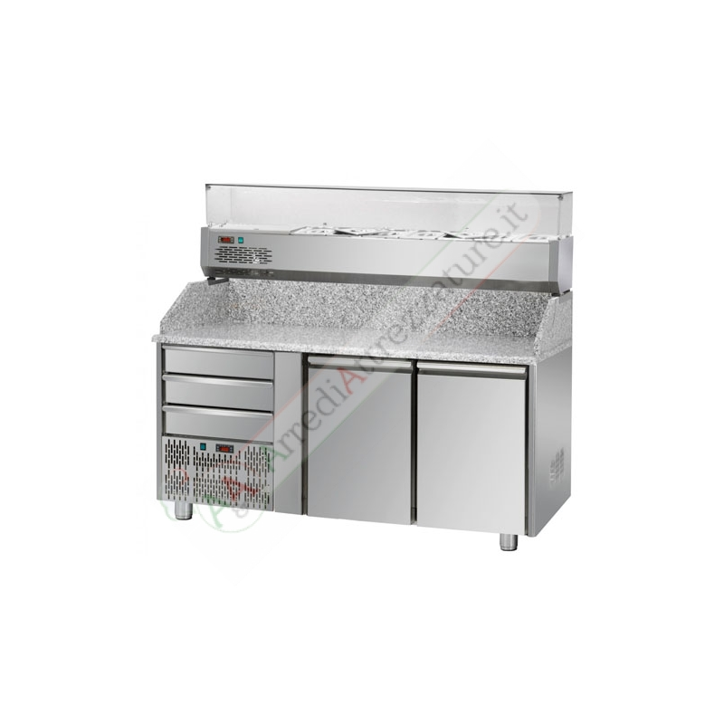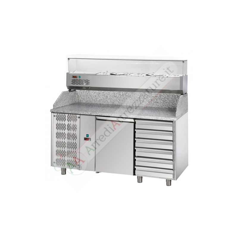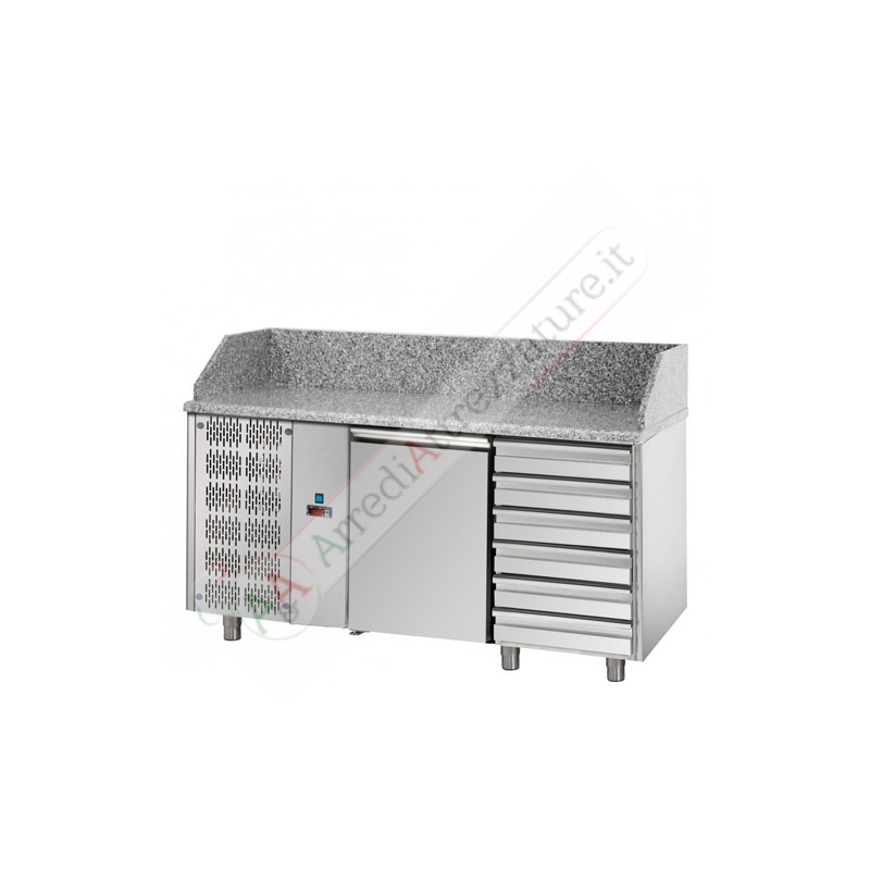 Questo tavolo e possibile averlo nelle varianti con un cassetto neutro, con tre cassetti neutri e con sei cassetti neutri o con l'accessorio della vetrina refrigerata (vaschette non incluse nel prezzo).
