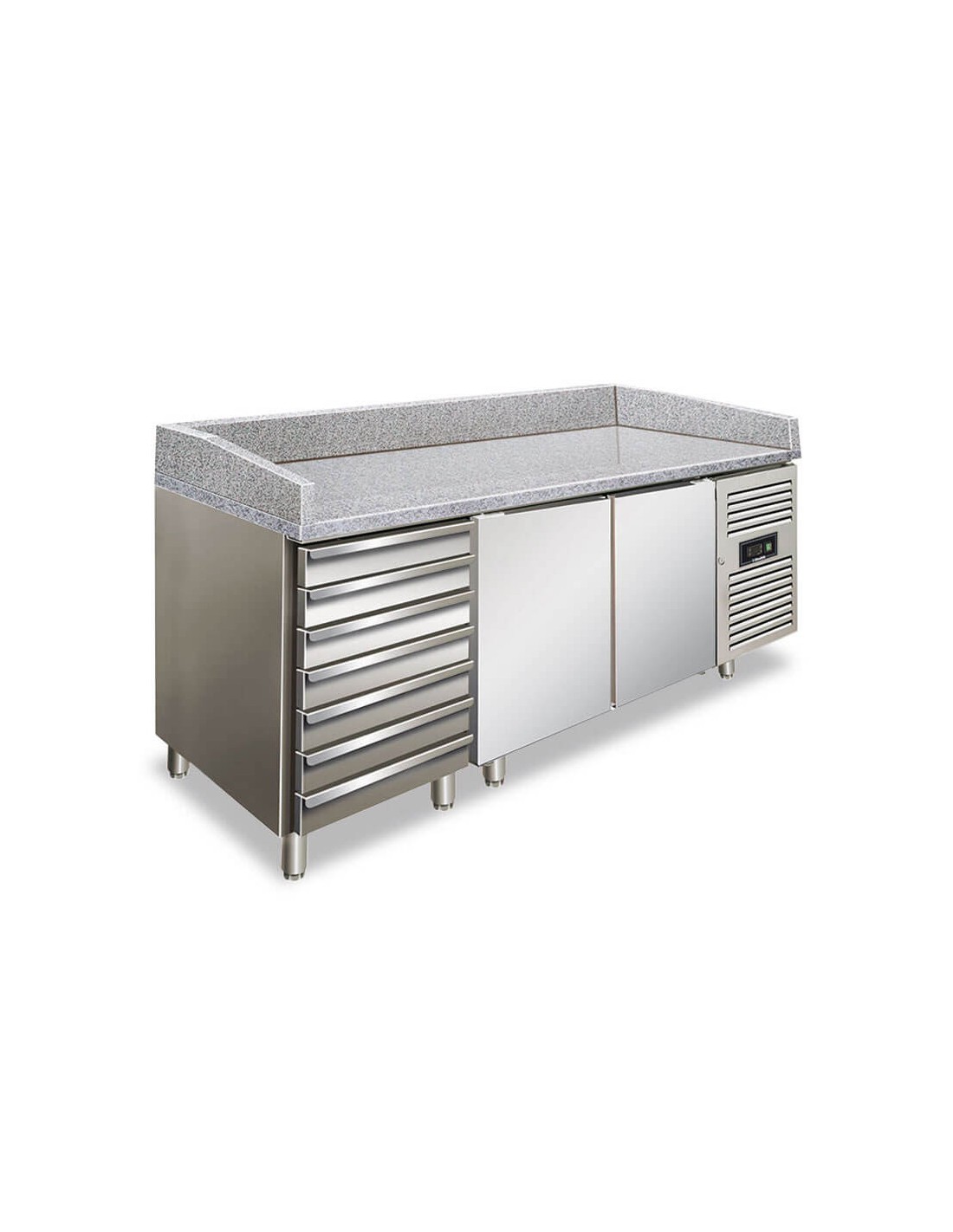 Banco Preparazione Pizza Refrigerato 2 Porte con Cassettiera - Piano in Granito, Acciaio Inox, 2025mm Efficienza e Funzionalità per la Tua Pizzeria