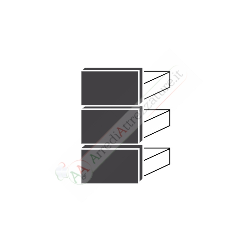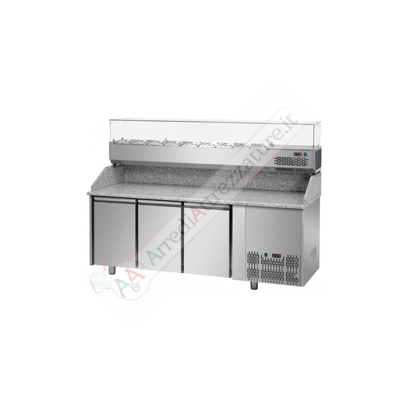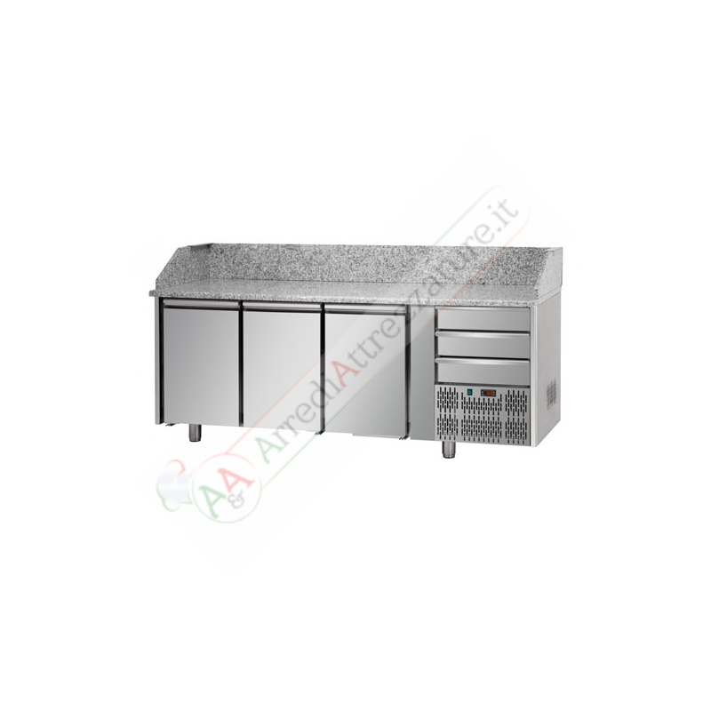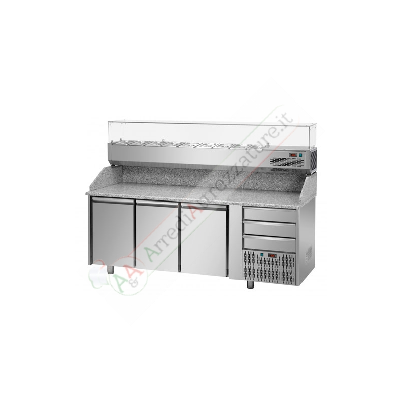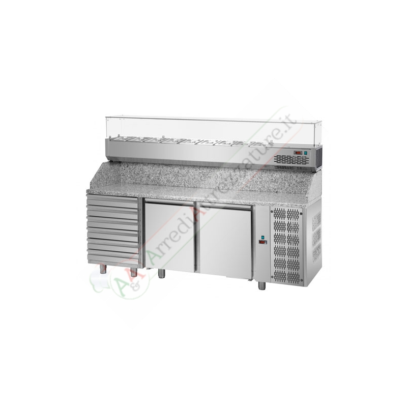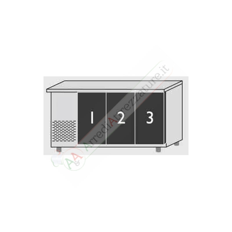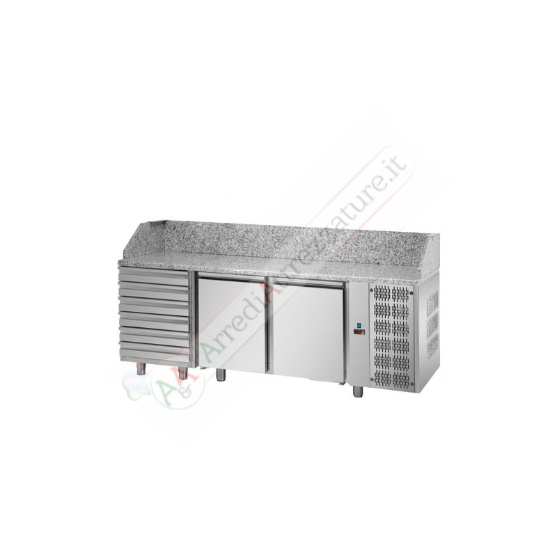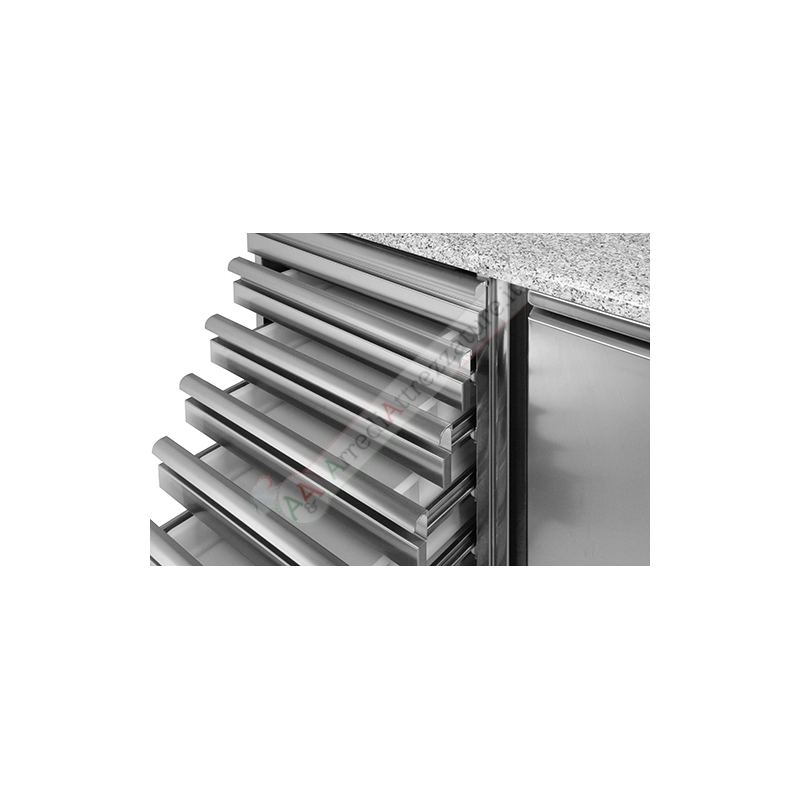 Questo tavolo e possibile averlo nelle varianti con un cassetto neutro, con tre cassetti neutri e con sei cassetti neutri o con l'accessorio della vetrina refrigerata (vaschette non incluse nel prezzo).
