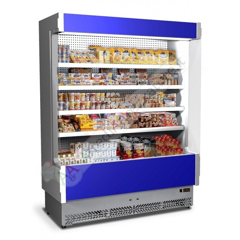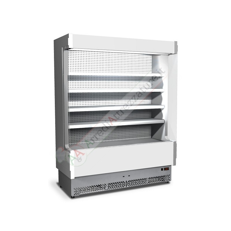 Murale espositivo a refrigerazione ventilata dalla struttura compatta ma con ampia superficie espositiva che la rende adatta alla piccola, media e grande distribuzione. La tecnologia, il design e la produzione "Made in Italy" garantiscono la qualità del prodotto facile da installare e da pulire e a basso consumo energetico nonché a basso impatto ambientale: la vasca è infatti realizzata senza l'uso di CFC. Possibilità di personalizzazioni su richiesta. La vetrina è dotata di spalle termoformate e coibentate con fianco in vetro temprato, pannello comandi elettronico, sbrinamento a fermata, illuminazione superiore con lampada a neon e tenda notte autoavvolgente manuale. Dispone inoltre di 4 ripiani in lamiera post-verniciata bianca atossica regolabili in altezza e dotati di portaprezzo e valvola R404A/R507. Disponibile anche nella versione in acciaio inox.