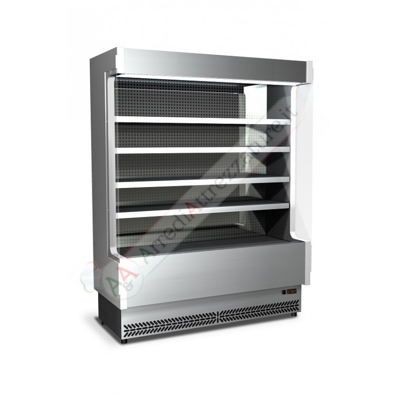 Murale espositivo a refrigerazione ventilata dalla struttura compatta ma con ampia superficie espositiva che la rende adatta alla piccola, media e grande distribuzione. La tecnologia, il design e la produzione "Made in Italy" garantiscono la qualità del prodotto facile da installare e da pulire e a basso consumo energetico nonché a basso impatto ambientale: la vasca è infatti realizzata senza l'uso di CFC. Possibilità di personalizzazioni su richiesta. La vetrina è dotata di spalle termoformate e coibentate con fianco in vetro temprato, pannello comandi elettronico, sbrinamento a fermata, illuminazione superiore con lampada a neon e tenda notte autoavvolgente manuale. Dispone inoltre di 4 ripiani in lamiera post-verniciata bianca atossica regolabili in altezza e dotati di portaprezzo e valvola R404A/R507. Disponibile anche nella versione in acciaio inox.