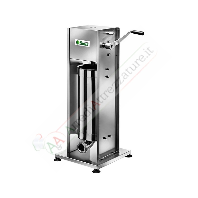 Struttura in acciaio inox, pistone in alluminio; 2 velocità: una lenta per l’avanzamento del pistone, l’altra veloce di ritorno. In dotazione 3 imbuti ø 8mm - 16,5mm - 23,5mm.
