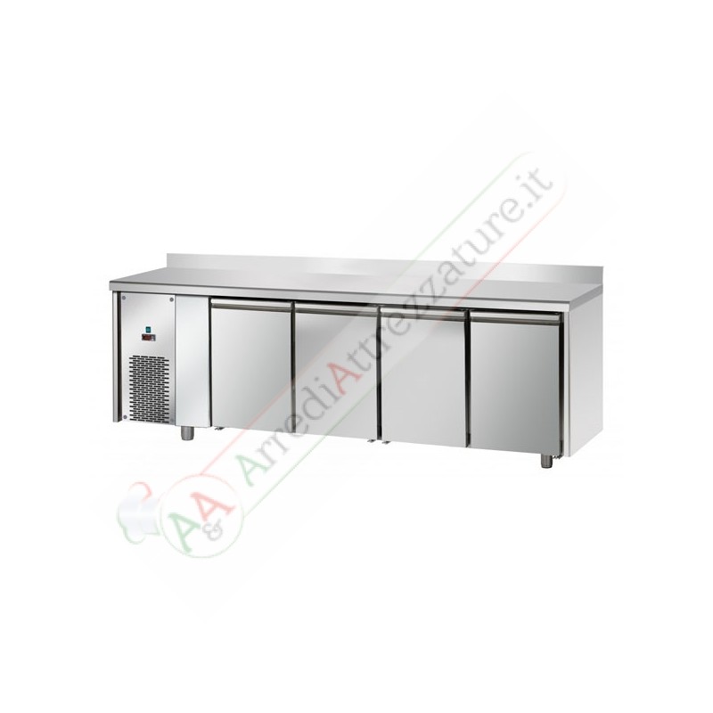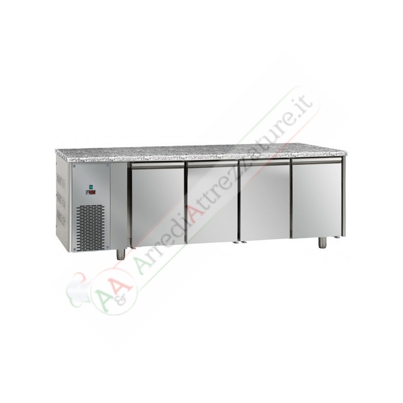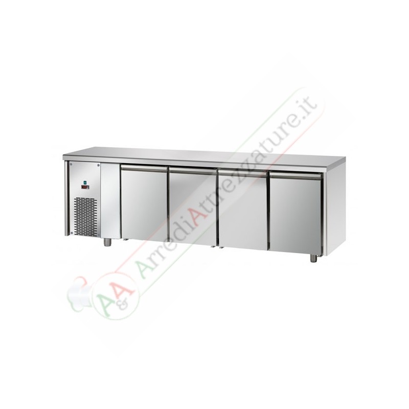 Tavolo refrigerato GN I/I a bassa temperatura con 4 porte, piano in acciaio inox e gruppo motore a sinistra; con varianti con alzatina, senza piano e piano in granito.