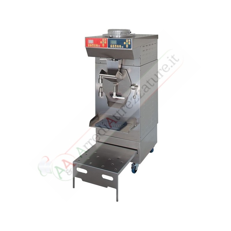 Modulo scalino a scomparsa per accedere alla vasca superiore direttamente dal fronte. Comoda e ampia tramoggia con prolunga per un rapido carico miscela. Bocca di uscita di grandi dimensioni per una rapida estrazione del gelato senza stressare il prodotto. Pannello comandi frontale con icone di selezione rapida programmi gelato, sorbetto, granita. Mensola di appoggio per qualsiasi tipo di contenitore, regolabile in profondità e altezza. Tutte le parti a contatto con la miscela o il gelato sono in acciaio inox e in materiale atossico facilmente accessibili e smontabili per la pulizia.