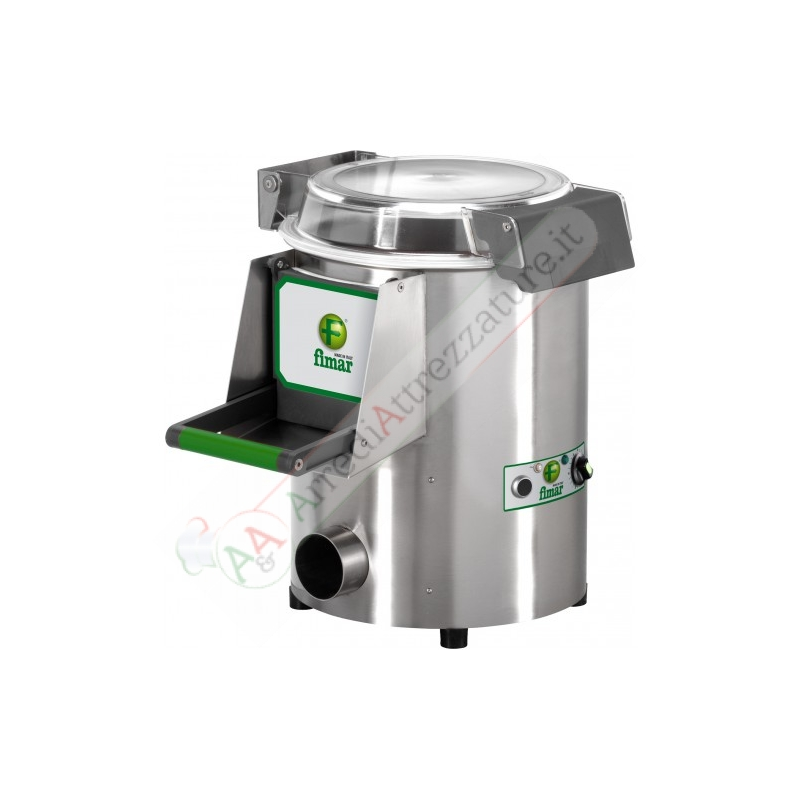 Macchina per pelare patate e carote da banco, scarico a lavandino, dotato di un piattello. Struttura in acciaio inox - coperchio superiore in policarbonato alimentare trasparente - microinterruttori di sicurezza su coperchio superiore e su bocca di uscita - pulsante espulsione prodotto - timer 0÷4 minuti - getto automatico d’acqua per favorire l’eliminazione dei residui di pelatura