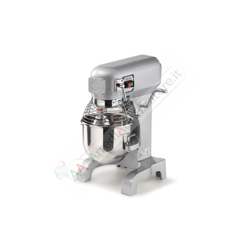 Impastatrice planetaria con una capacità di 10 litri per uso professionale indicata per impasti morbidi e OCCASIONALMENTE per impasti di media consistenza (es. pane e pizza). Struttura realizzata in fusione di alluminio. Vasca in Acciaio Inox AISI 304. Selettore di velocità.