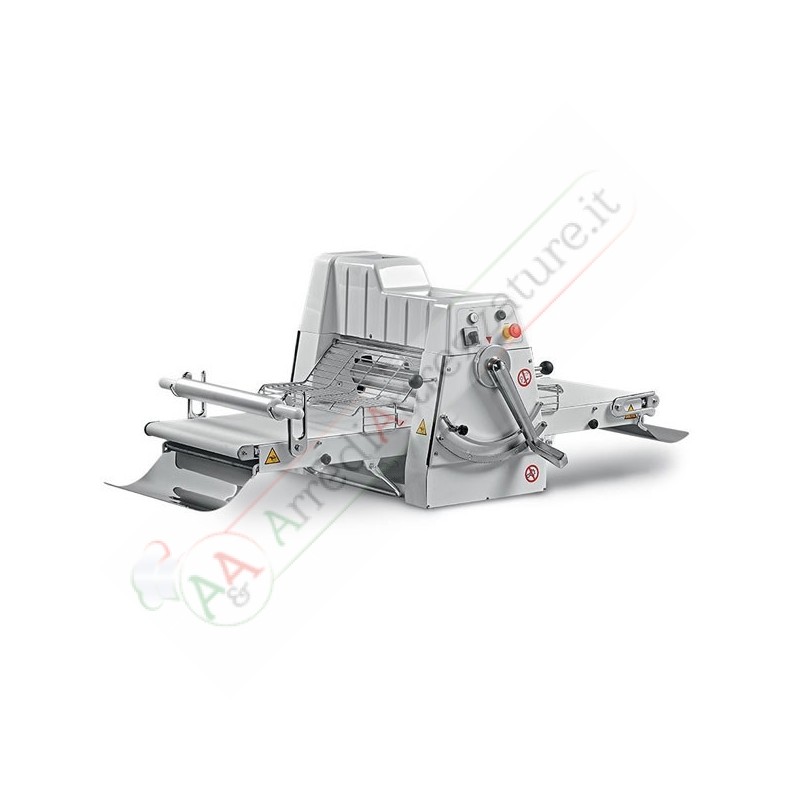 Possono lavorare qualsiasi tipo di pasta fino a spessori sottilissimi. I cilindri di laminazione sono cromati al cromo duro, rettificati e lucidati. I raschiatori sono facilmente smontabili per permetterne la pulizia. I cuscinetti sono tutti schermati per evitare l’infiltrazione della farina. I tappeti trasportatori sono a velocità variabile per evitare grinze nella sfoglia. I piani sono rialzabili, in modo da contenere gli ingombri a macchina in riposo. L’impianto elettrico è a bassa tensione ed è a doppio comando (manuale e a pedale). I ripari sono del tipo anti infortunistico e sono collegati all’impianto elettrico mediante finecorsa.