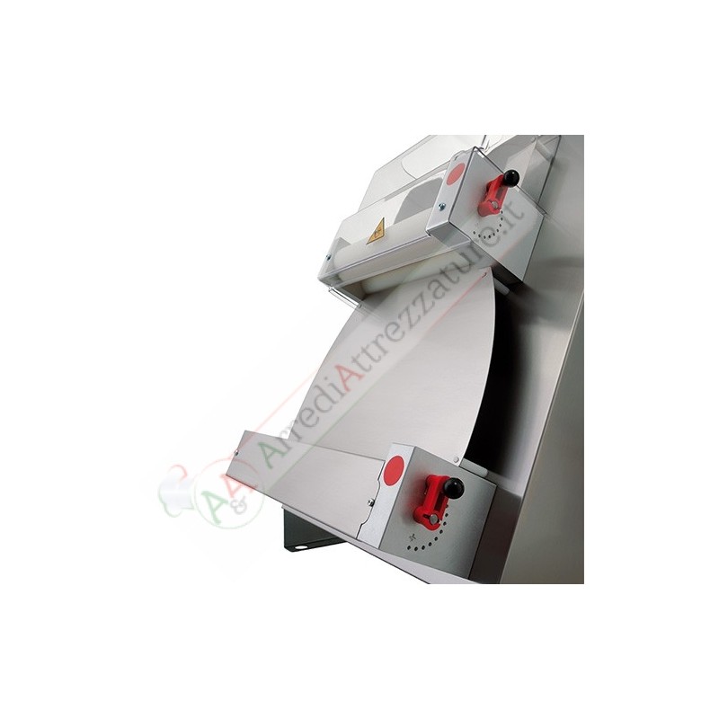 Queste versioni hanno il gruppo rulli superiore parallelo rispetto a quello inferiore per la produzione di basi circolari o rettangolari. I comandi sono digitali. La pallina lievemente infarinata viene inserita manualmente tra i rulli attraverso la bocchetta della protezione superiore e automaticamente verrà prodotta una base che con intervento manuale raggiungerà la forma rettangolare, ideale per la cottura in teglia. Se all’uscita del gruppo rulli superiore l’impasto viene manualmente ruotato di mezzo giro dall’operatore, si otterrà un disco di pasta. Si tratta pertanto di una macchina estremamente versatile e funzionale grazie anche al pedale elettrico di serie.