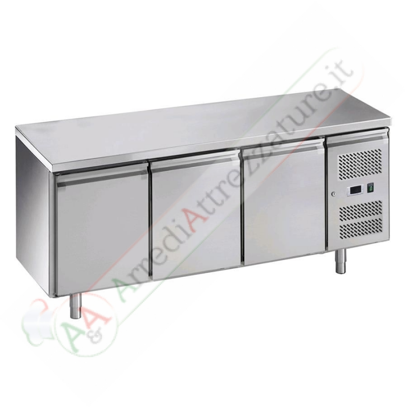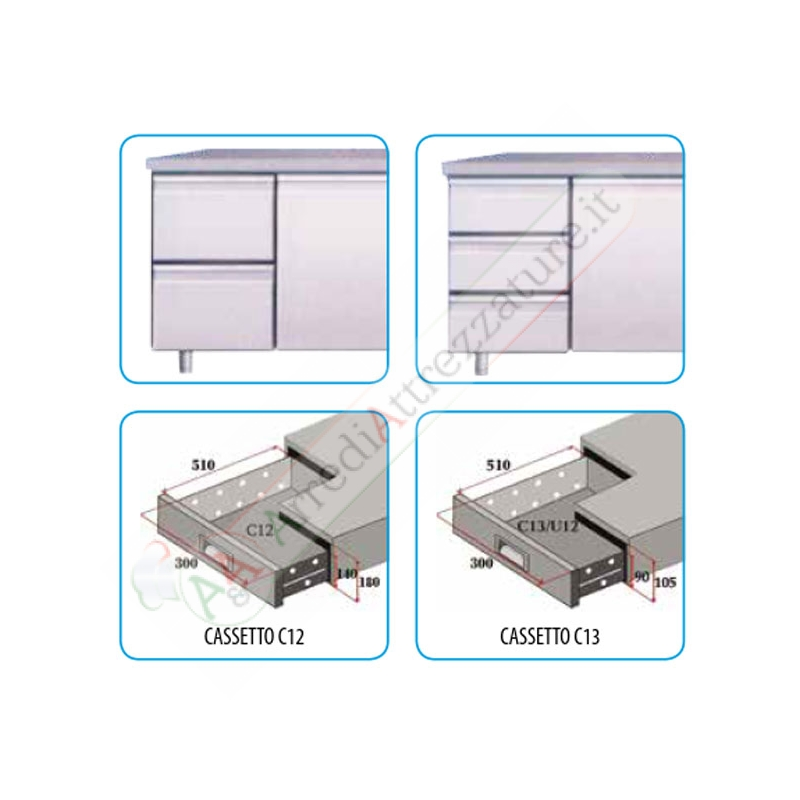 Sbrinamento automatico con resistenza elettrica e controllo automatico della temperatura di sbrinamento. Evaporazione automatica dell’acqua di condensa. Evaporatore trattato anticorrosione. Porta con molla di ritorno. Guarnizione porta estraibile senza utensili. Fondo con angoli arrotondati. Facile intercambiabilità porte con cassettiere da due e tre cassetti. Cassettiere con guide telescopiche in acciaio inox a totale estraibilità. Piedini in acc. Inox regolabili in altezza. Possibilità di appoggiare al muro.