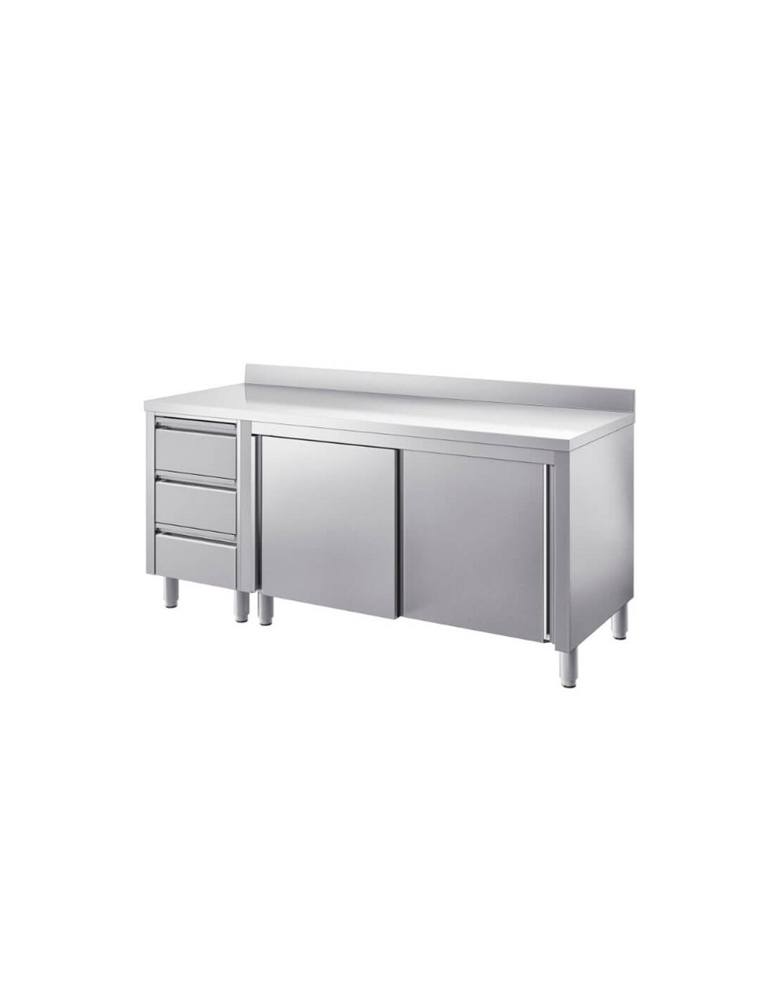 Caratteristiche:dimensioni: 130x70x90 cmmateriale: Acciaio inox2 ante scorrevoli con cassettiera in linea prof 70e alzatina